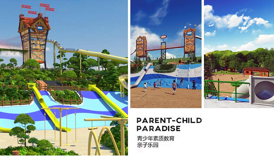 酷炫摩天双子塔,是园区最具魅力的大型训练设备,它结合了绳网攀爬、攀岩攀爬、坡地滑道、高空滑道等多种功能性设备,让孩子通过攀爬、滑、走、跑等方式充分锻炼和提升孩子的观察力、身体平衡能力,尤其是双塔上 15 米高、44 米长的巨型滑道,更能够大大锻炼和增进孩子的勇气,并带给孩子们畅享欢乐的喜悦。